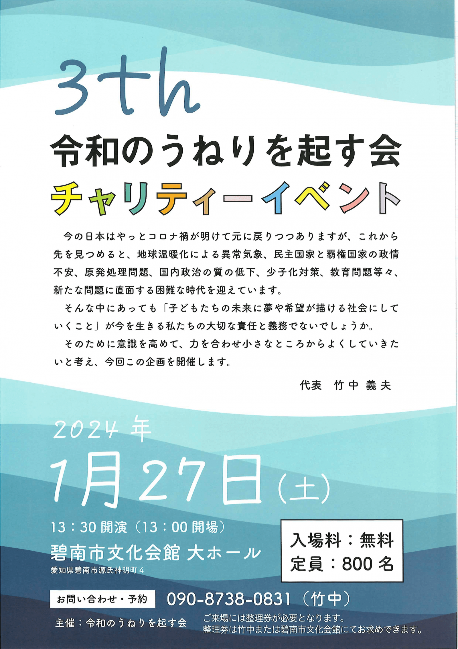 2024年1月27日(土)に碧南市文化会館にて、「令和のうねりを起こす会」主催のチャリティーイベントを開催いたします。