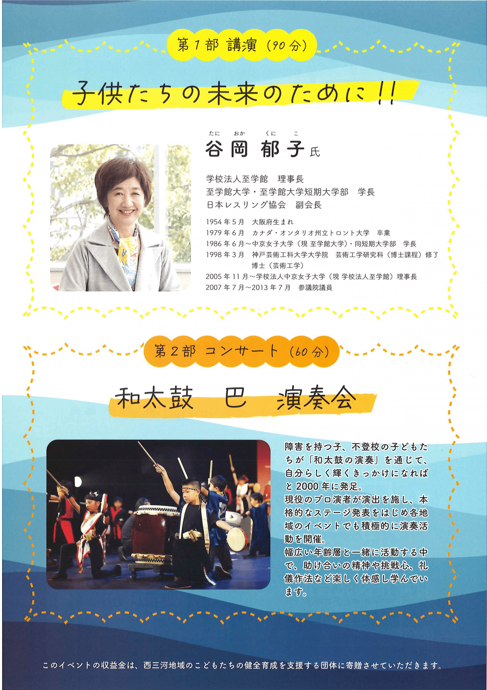 当日は、至学館大(大府市)の谷岡郁子理事長が「子供たちの未来のために!!」をテーマとした講演や、子どもたちによる和太鼓演奏を行ないます。また、会場に被災地支援の募金箱を設置いたします。