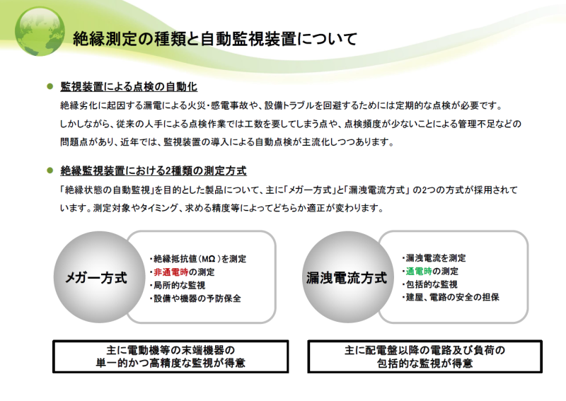 予防保全として重要なのは、絶縁抵抗を日常点検・定期点検で管理することです。絶縁抵抗を測る測定器として、手動で測る「絶縁抵抗計(メガー)」があり、回路の絶縁状態を測定できます。